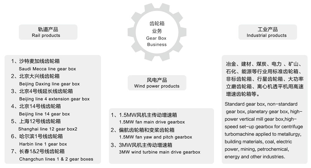 冶金、建材、煤炭、电力、矿山、石化、能源等行业用标准齿轮箱、非标准齿轮箱、行星齿轮箱、大功率立磨齿轮箱、离心机透平机用高速增速齿轮箱等。